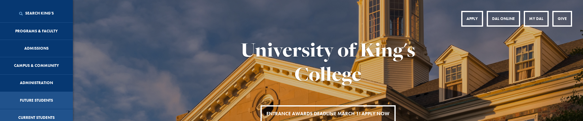 Founded in 1789 by Royal Charter, The University of King's College is one of Canadaâ??s oldest universities. Currently, it is located in Halifax, Nova Scotia and has approximately 800 students including both undergraduates and graduates. It offers a diverse range of programming in the humanities, social sciences, and sciences.