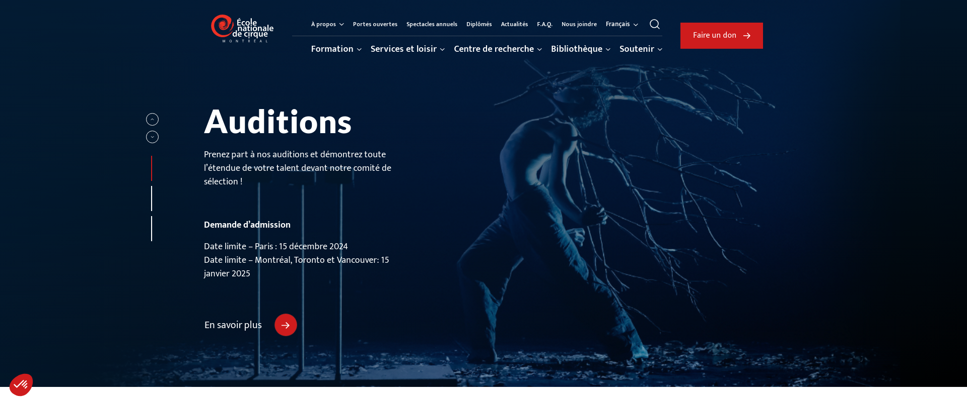 Located in Montreal, Quebec, â??cole Nationale de Cirque (also known as â??Cirque Schoolâ?) is a unique higher education institution that specializes in teaching the world of circus arts. Founded in 1989, it is Canadaâ??s only free-standing professional training institution for circus arts, offering programs focused on training students to become world-class circus professionals. Offering both graduate and undergraduate courses, the school provides a vibrant and enriching educational environment designed to offer students an unparalleled experience in learning and performing.