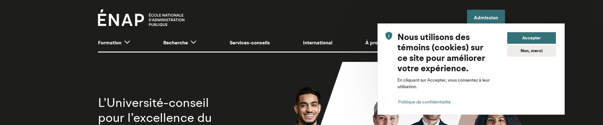 The Université du Quèbec â?? Ã?cole nationale d'administration publique (ENAP) is a public university in Quebec, Canada and is a member of the Université du Quèbec network. Its Campus is located in the Montmorency borough of Laval, about 9 km north of Montreal. ENAP offers a wide variety of graduate and postgraduate degree programs geared towards public administration and policy, and is one of the few universities in Canada that specialize in these disciplines.
