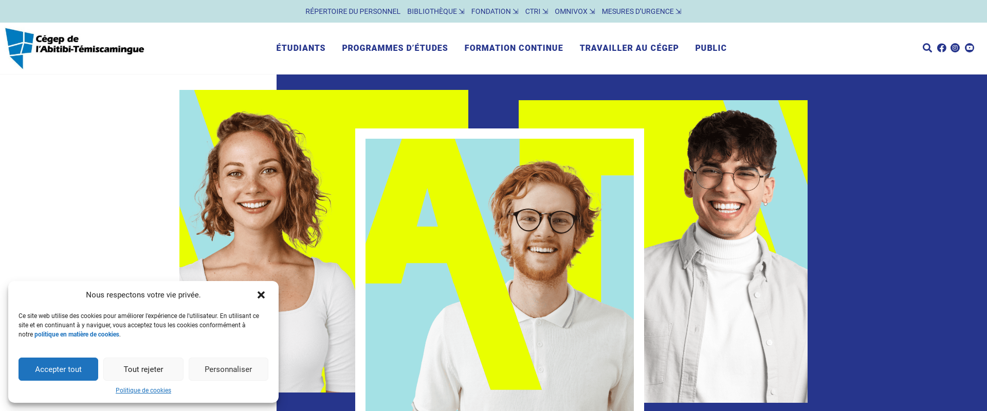Coll?ge d'enseignement g?n?ral et professionnel (C?GEP) d'Abitibi-T?miscamingue is a public college situated in the Abitibi-Temiscamingue region in Quebec, Canada. Located in the cities of Amos, La Sarre, and Rouyn-Noranda, C?GEP d'Abitibi-T?miscamingue offers a wide range of professionally oriented college diploma programs, professional development programs, university collaboration programs, geography workshops, and several innovative options such as distance education and continuing education.