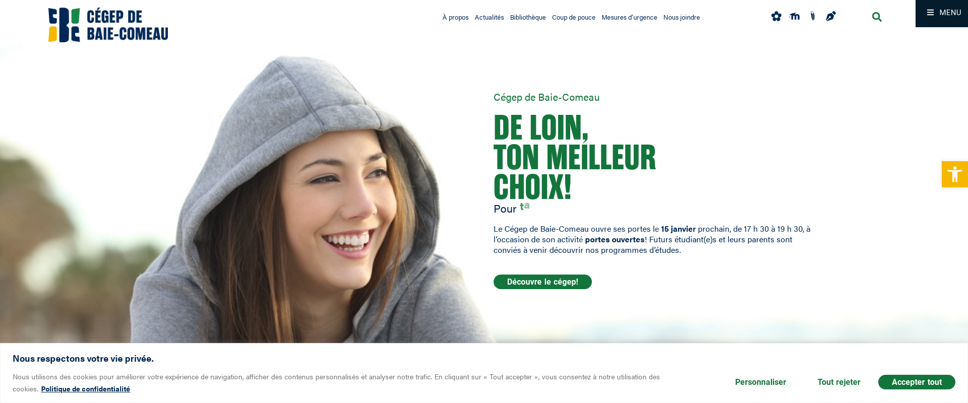 The college offers a variety of two-year programs such as Business Administration, Social Sciences, and Computer Science, along with three-year programs in Arts and Sciences, Mathematics, and Information Technology. To meet the needs of an ever-evolving job market, C?GEP de Baie-Comeau also hosts a variety of specific career-oriented programs and Certificates. These include Certificate Programs in Administration, Music Production, Animation, and Basic Construction Trades, as well as specialized workshops and personalized training courses.