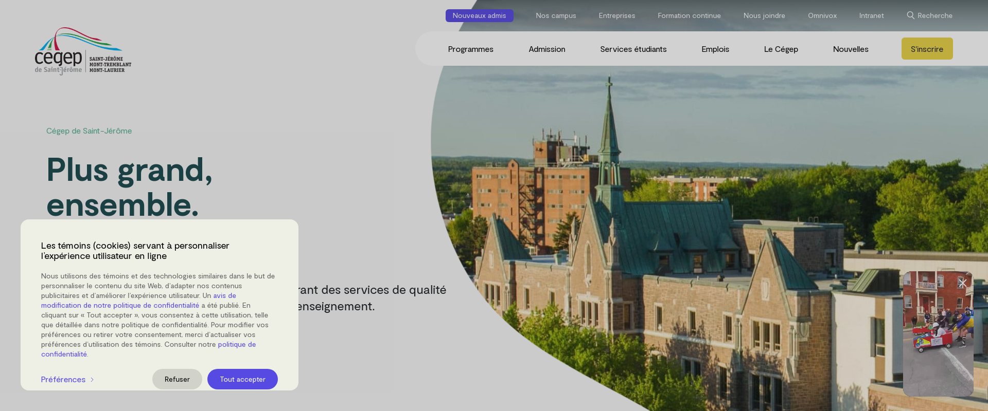 Coll?ge d'enseignement g?n?ral et professionnel (C?GEP) de Saint-J?r?me is a publicly funded college in Canada that serves the educational needs of over two thousand students. The college provides a wide range of courses and diplomas for both college transfer education and career-focused post-secondary studies. Located in the beautiful Laurentian Mountains north of Montr?al, the college values and embraces its commitment to the well-being of its students and provides a learning environment that fosters the development of responsible individuals and citizens.